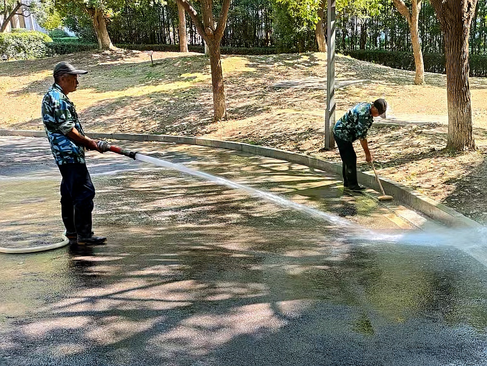 物业服务部开展全校区环境清洁与绿化整治工作,以整洁宜人的校园新面貌迎接师生返校。保洁组集中清理校区内枯枝落叶及各类垃圾,清运量超600袋,逐一擦拭果壳箱、垃圾桶500余只,确保公共设施洁净如新。针对路沿缝隙等卫生死角,安排人工清除杂草,彻底清洗路面、连廊及行政楼周边水系,重现校园清新景致。绿化工同步修剪绿篱草坪、排查清理枯枝,保持绿化美观。