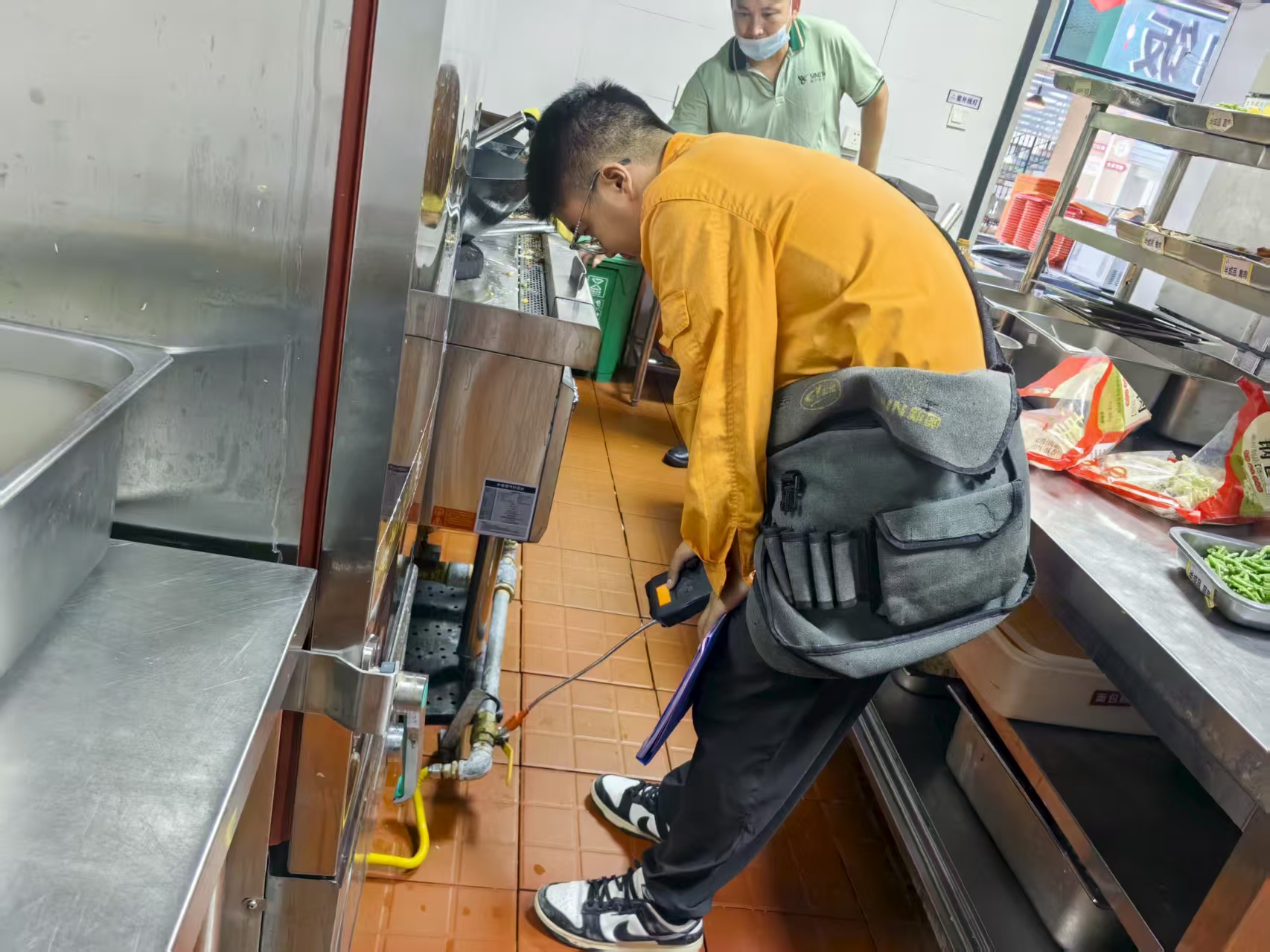 本次检查内容涵盖食堂内所有与燃气相关的区域和设施,如燃气输送管道、燃气流量计、压力表、燃气报警器、切断阀、燃气灶熄火保护装置等。检测人员使用专业检漏设备对燃气管道进行全面检测,重点排查管道焊缝、阀门接口等易泄漏部位,检测接口密封性,校验计量表精度,同时检查燃气灶等器具是否安全合规、燃气管道是否存在腐锈情况、燃气管道及设施附近是否存在堆放易燃易爆物品等燃气安全隐患。此外,检查人员对燃气报警器与切断阀的功能进行现场测试,确保设备持续有效运行。